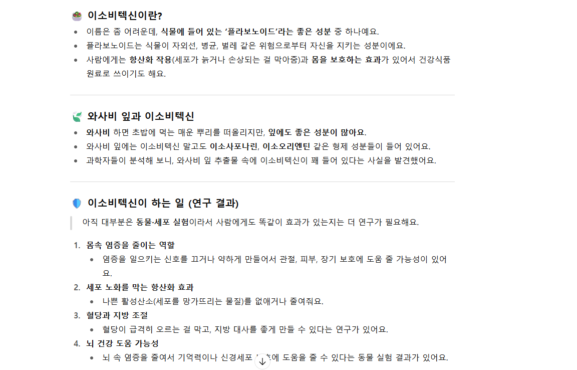 “와사비 잎 추출물에는 이소비텍신이라는 좋은 식물 성분이 들어 있고, 염증 완화·항산화·대사 건강에 도움을 줄 가능성이 있지만, 아직 사람에게서 확실히 검증된 건 아니니 식품 형태로 즐기거나 보조적으로만 쓰는 게 좋아요.”